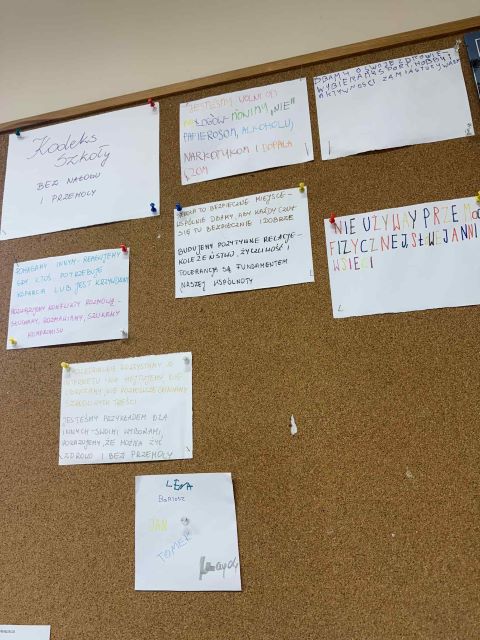 Każdy zespół uczniowski stworzył swój kodeks na miarę wieku i możliwości, w formie dopasowanej do poziomu klasy. Uczniowie podpisali się pod nim, deklarując przestrzeganie przyjętych zasad oraz dbanie o atmosferę wolną od przemocy i nałogów.