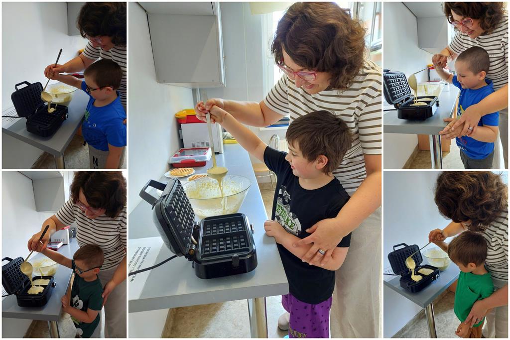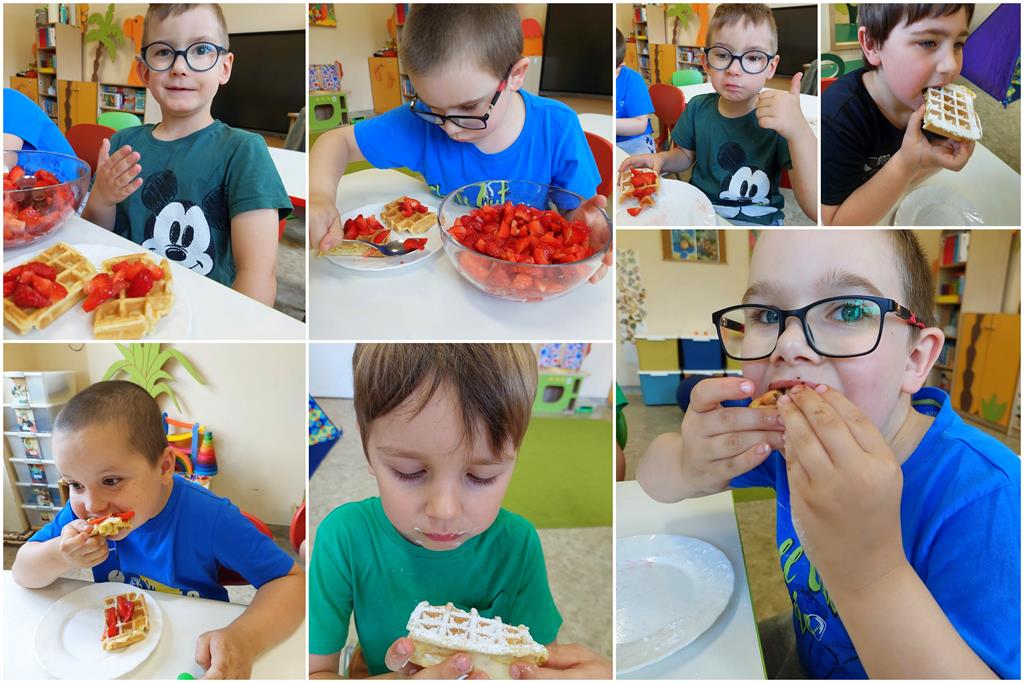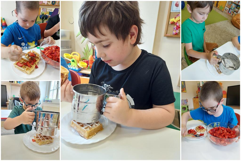 W środę unosił się naszym przedszkolu cudny zapach wanilii. Mali kucharze z grupy "Żabek" zapoznali się z przepisem mamy Leona na pyszne gofry. Dzieci pod kierunkiem pań, z wielkim zapałem odmierzały składniki i wsypywały je do miski. Kiedy wszystko było gotowe, przystąpiły do pieczenia. Gofry wyszły znakomite!!! Było słodko, smacznie i domowo, a główną rolę na gofrach grał cukier puder i truskawki.